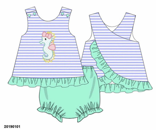 Pre Order 135: OG Seahorse- Girls Applique Bloomer Set