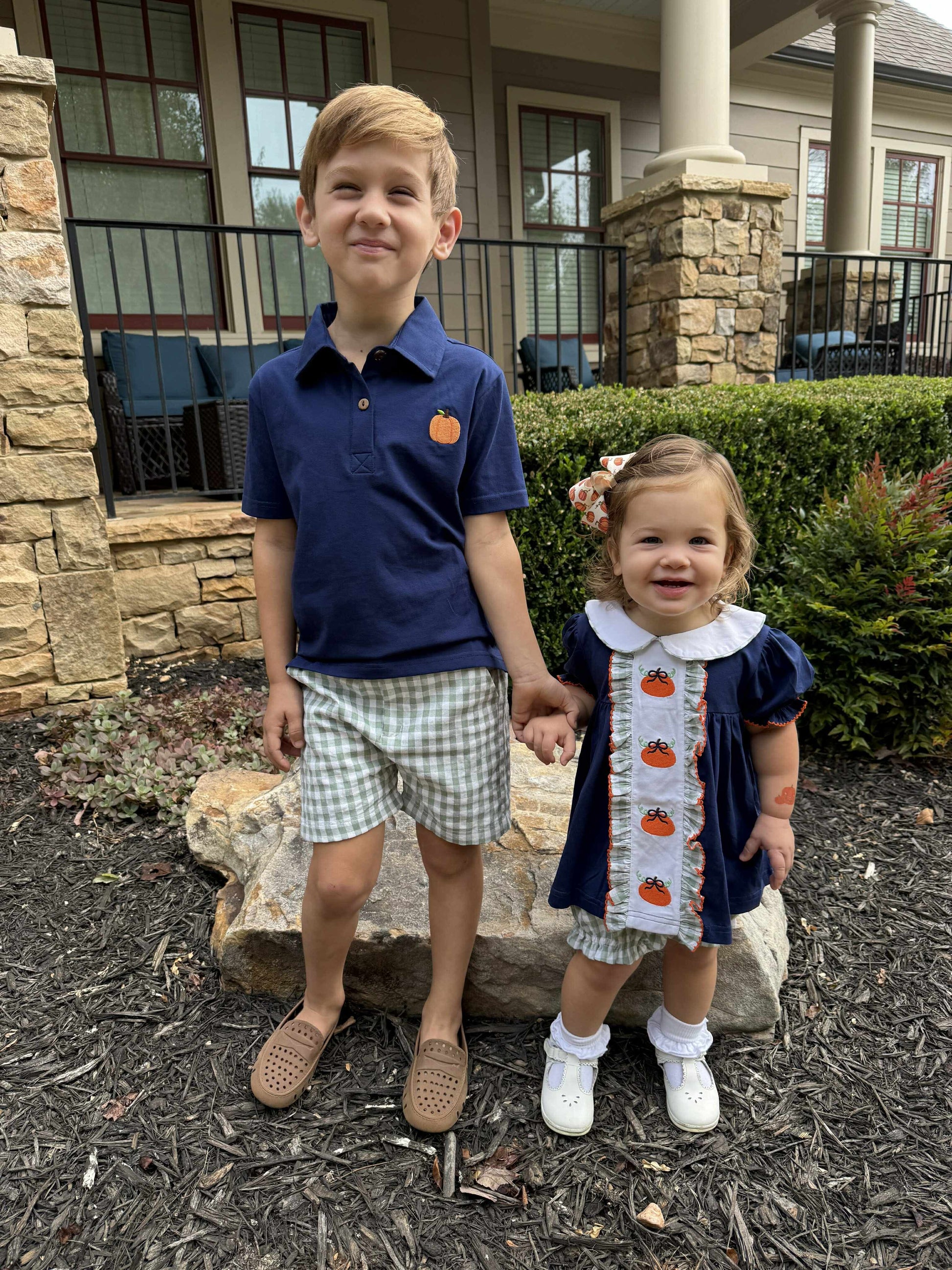 RTS: Navy & Seersucker Check Pumpkins- Boys Polo Traditional Short Set
