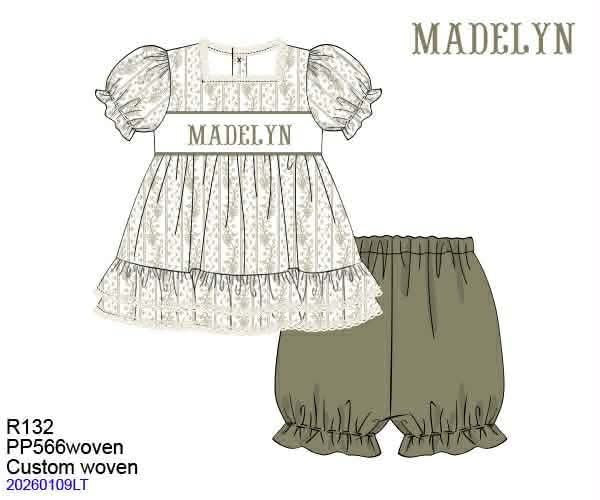 Pre Order 140: Biltmore Vines- Girls Name Smock Knit Bubble Short Set
