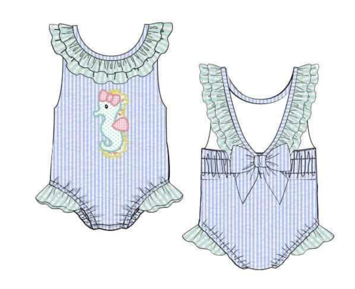 RTS: DEFECT- OG Seahorses- Girls Seersucker 1pc Swim